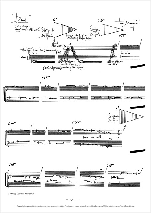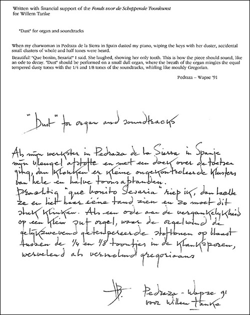 When my charwoman in Pedraza de la Sierra in Spain dusted my piano, wiping the keys with her duster, accidental small clusters of whole and half tones were heard. Beautiful! 'Que bonito, Sesaria!', I said. She laughed, showing her only tooth. This is how the piece should sound, like an ode to decay. Dust should be performed on a small dull organ, with the breath of the organ mingling its equal tempered dusty tones with the 1/4 and 1/8 tones of the soundtracks, whirling like mouldy Gregorian. Composed for Willem Tanke, with financial support of the Fonds voor de Scheppende Toonkunst (from the score Dust, Donemus 1992)
