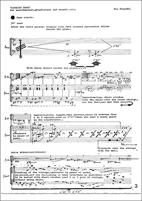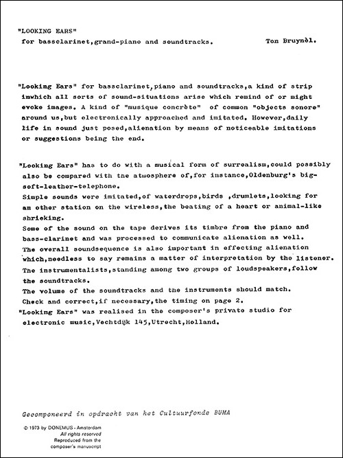 Looking Ears is a dialogue between eyes and ears. The soundtracks on tape hold suggestions of sounding subjects and situations from our environment, which succeed each other as a kind of imagination of a cartoon and which have been made resonant electronically. They strongly remind us of … but don 't exist in reality. When listening a feeling of contradiction arises. The instruments play a connecting part in this. Looking Ears reflects to me words full of hope of the brain-physician and Nobel Prize winner, Sir John Eccles, who said: "There's no such thing as sound or light or colour in the world. These are just electro-magnetic vibrations, ordinary photons. They're just purely physical things, but in order to perceive them as sound, light, smell, taste or pain, all this is created out of brain; events by some mysterious process that we don't understand". (from the sleeve notes of the CD Looking Ears 2) A kind of comical note can be heard in the music. Sounds from our daily environment – e.g. water, birds, wind, a radio signal and a beating heart – are all imitated electronically. This, along with the bass clarinet and piano, creates a strange connection, a type of surrealism in the music. Commissioned by the BUMA Cultural Fund. (from the Music Information Centre Donemus MuziekGroep Nederland)