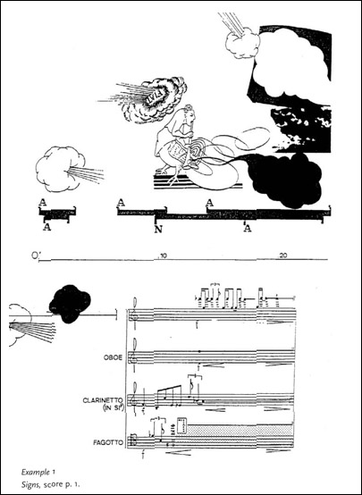 Performance: The players are positioned between two groups of loudspeakers, each placed approximately 3 yards away from the instrumentalists. Each player follows his part from a score. Since the sound material is derived entirely from the five wind instruments, including not only their characteristic quintet timbres but also the sounds made by their keys and valves, mouthpieces, the players' activities with/in their instruments, I decided to reproduce these complicated sounds, wich cannot be notated, visually with the collaboration of an artist to aid the quintet players in following their parts. It is therefore functional to project, if possible, the illustrated parts of the score, or the entire score of Signs during performance. The title Signs refers to the attraction exercised on people by toys for blowing audible signs. The possibilities of these instruments have been formed to a great extent both audibly and visually into new structures. Signs begins with the flute being warmed up by being blown straight into the mouthpiece. A journey through the pipes of the quintet ensues, a journey that ends at the mouthpiece, the energy of the reed set into vibration, then sudden silence. (score Signs, Donemus 1969) Signs consists of three movements, which proceed without pause. The first movement is subdivided into five fragments, which last two minutes. In this section, the ‘valve material’ on the tape plays an important role. The second movement is characterized by blowing. This section is directly connected with the techniques used in Bruynèl’s first wind quintet, Mécanique. Here, the tape plays a more or less soloistic role and the wind instruments continuously produce serious and dignified sounds. The second movement also has five fragments. The third and last movement is the largest and embodies the core of the composition. The ending is abrupt, a characteristic of other works by Bruynèl. Commissioned by the BUMA Cultural Fund. Dedicated to the Ardito Quintet. (from the Music Information Centre Donemus MuziekGroep Nederland)